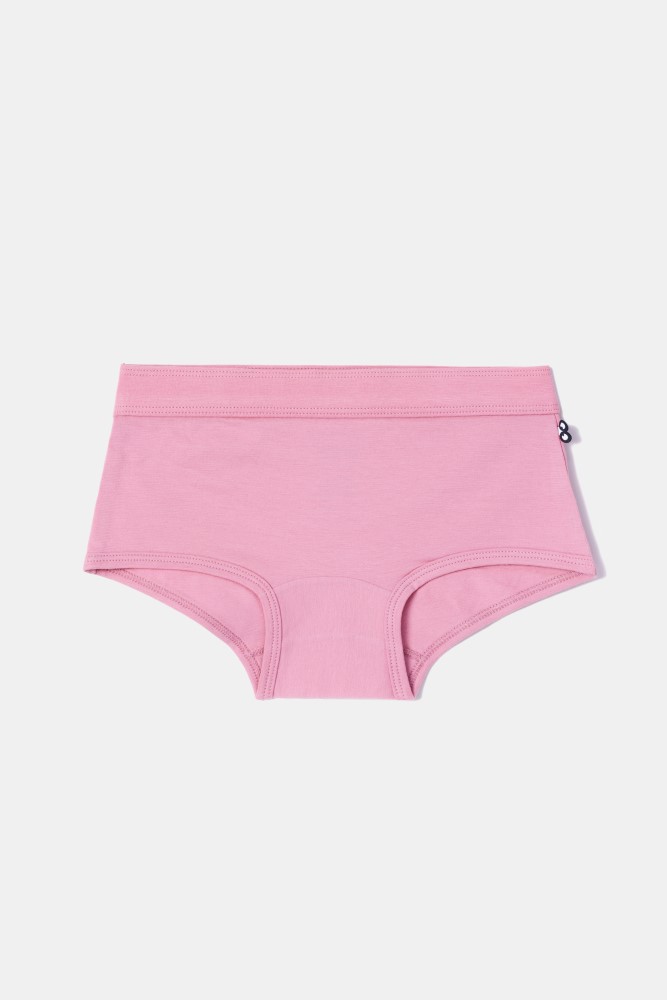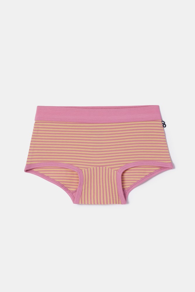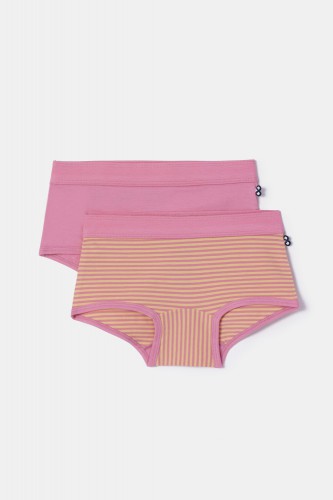 Set van twee shorty onderbroeken van stretch katoen. De 1 is effen roze, de ander is geel gestreept. Verkrijgbaar in de maten 24m/2y-16y.