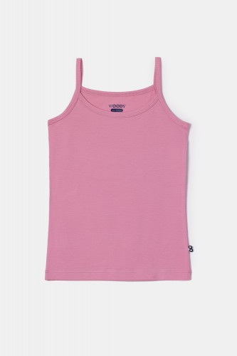 Woody singlet met spaghettibandjes voor meisjes in soepel en rekbaar katoen. Dit roze onderlijfje draag je onder een trui, T-shirt of pyjama. Verkrijgbaar in de maten 24m/2y-16y.