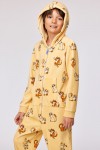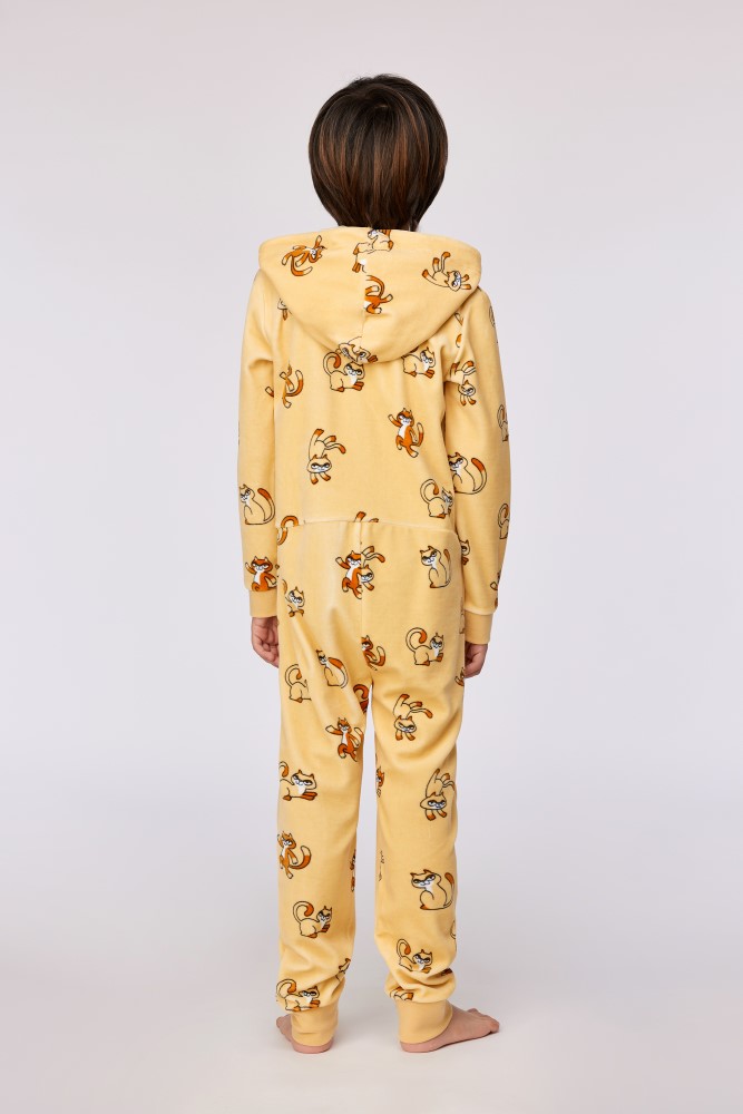 Gele unisex onesie van velours. De onesie heeft een kattenprint en is verkrijgbaar in de maten 24m/2y-XXL.