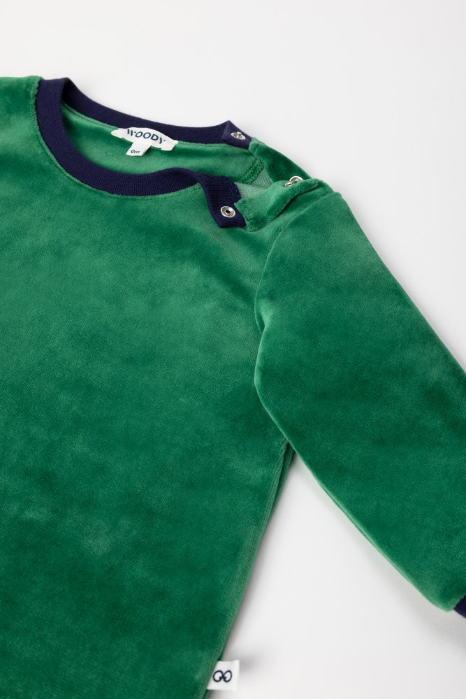 Donkergroene pyjama van velours. Het bovenstuk met de mouwboorden en hals in een contrasterende blauwe kleur heeft een print van een duif. De broek is blauw-groen gestreept. De pyjama is verkrijgbaar in de maten 0m-XXL en heeft een schoudersluiting bij de maten 0-18m.