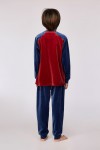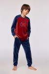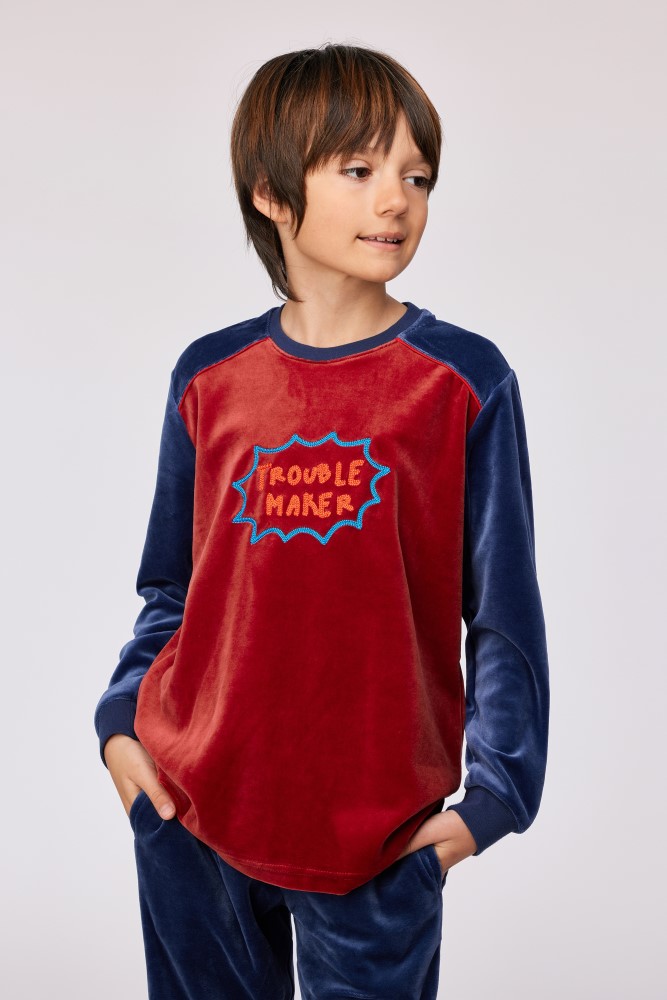 Pyjama van velours met contrasterende donkerblauwe mouwen en broek. Op het bovenstuk staat de tekst 'trouble maker' en de broek heeft zakken. Verkrijgbaar in de maten 24m/2y-XXL.