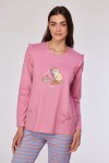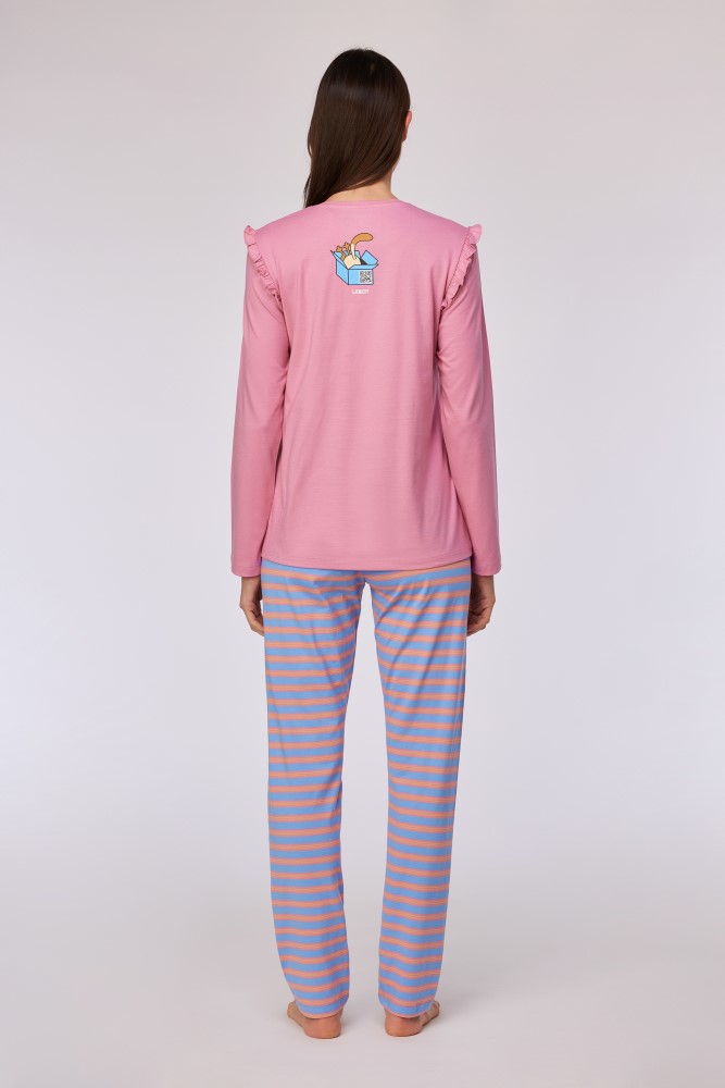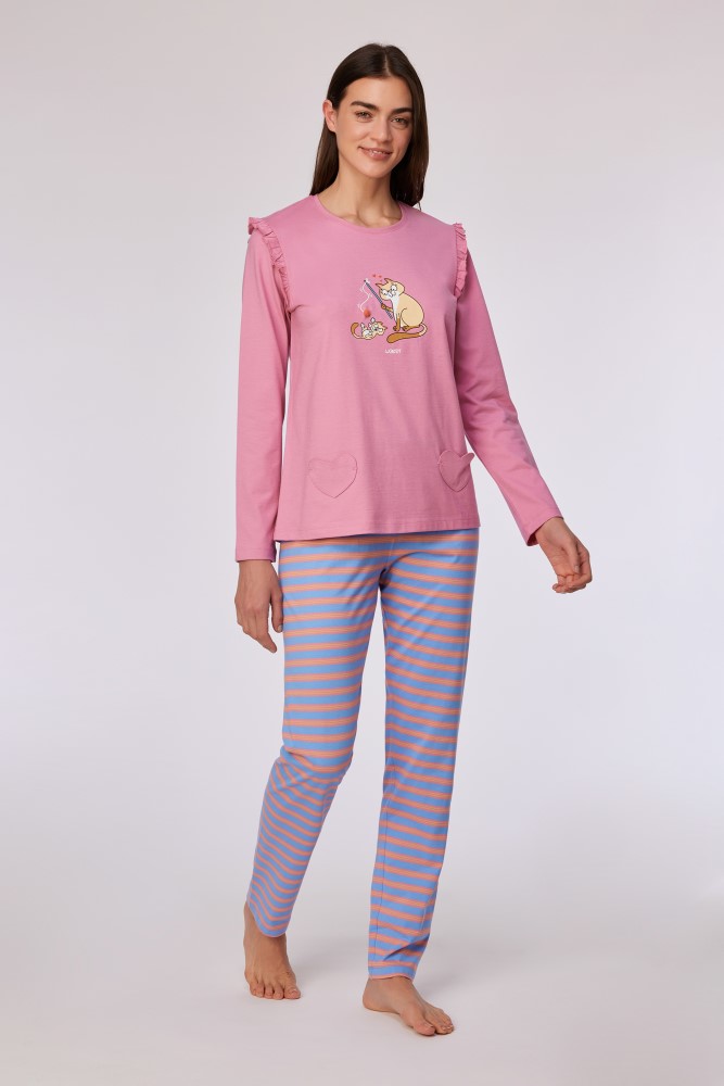 Roze pyjama van 100% katoen. Het roze bovenstuk heeft twee hartvormige zakjes, een kattenprint op de voor- en achterkant en een fantasie aan de mouwen. De broek is lichtblauw met gele en roze strepen. De pyjama is verkrijgbaar in de maten 0m-XXL. Voor dematen 0m-8y is er een sluiting in de rug voorzien.