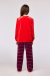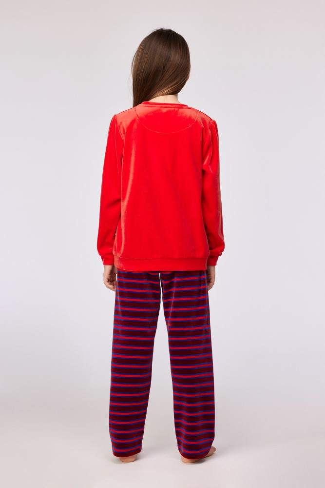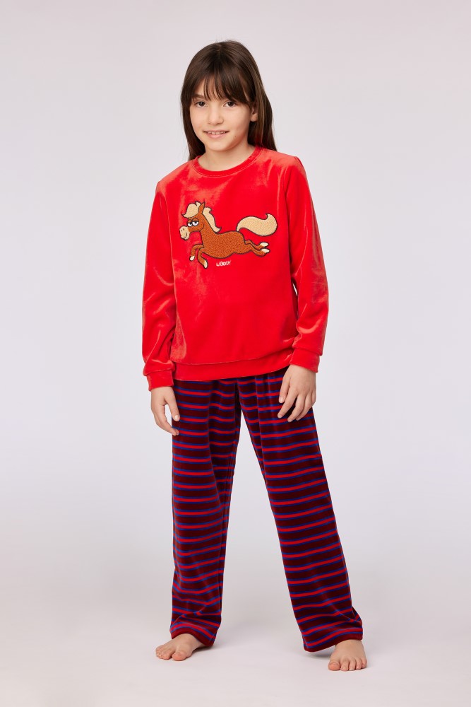Rode pyjama van velours. Het rode bovenstuk heeft een grote ponyprint. De broek is blauw-rood gestreept. Verkrijgbaar in de maten 24m/2y-XXL. Voor de maten 24m/2y-8y is er een sluiting in de rug voorzien.
