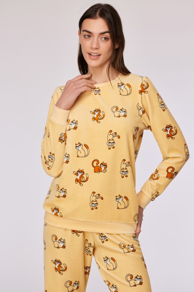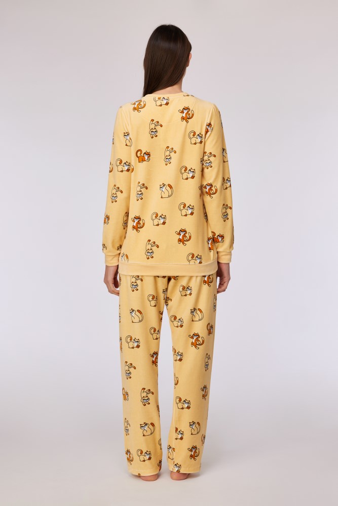 Gele pyjama van velours. Zowel het bovenstuk als de broek hebben een kattenprint. Verkrijgbaar in de maten 24m/2y-XXL. Voor de maten 24m/2y-8y is er een sluiting in de rug voorzien.