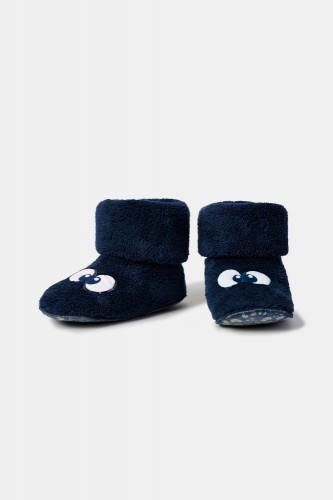 Diepblauwe pantoffels in teddystof met ogen. De pantoffels kunnen omgeplooid of lang gelaten worden. Verkrijgbaar in de maten 22-26 tot 43-46.