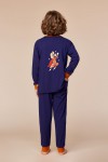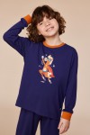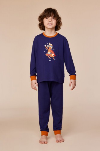 Donkerblauwe pyjama van soepel katoen. Op het bovenstuk staat een grote pony die je zowel op de voor- als achterkant kunt vinden. De mouwuiteinden, hals en pijpuiteinden zijn in een contrasterende oranje/bruine kleur. De pyjama is verkrijgbaar in de maten 24m/2Y-XXL.