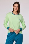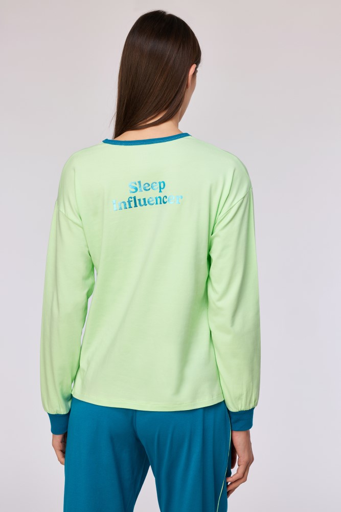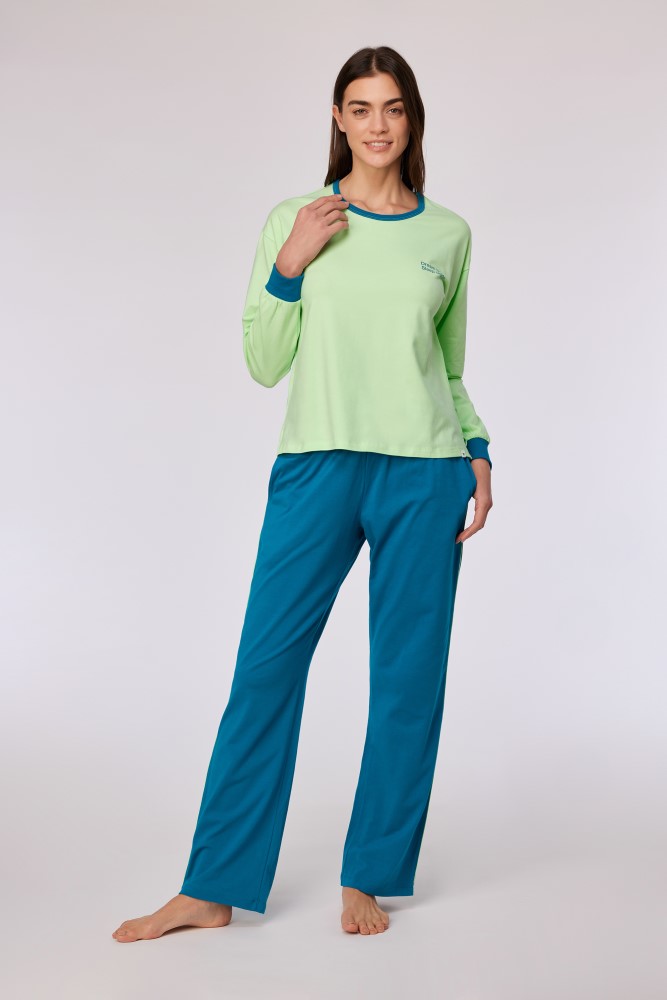 Blauw-groene winterpyjama, gemaakt van soepel katoen. Deze pyjama met groene sweater en lange blauwgroene broek heeft de opschriften 'Dream big, sleep bigger' en Sleep influencer'. Verkrijgbaar in de maten 24m/2y-XXL.