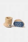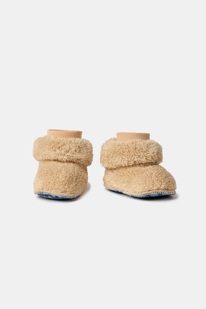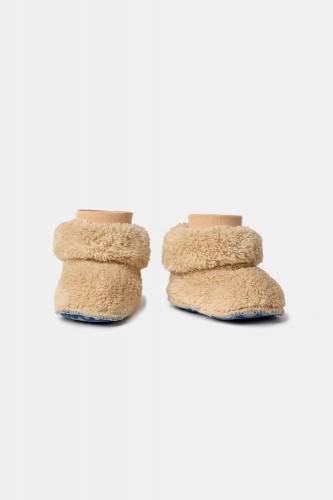 Beige pantoffels in teddystof. De pantoffels kunnen omgeplooid of lang gelaten worden. Verkrijgbaar in de maten 0-6m tot 43-46.