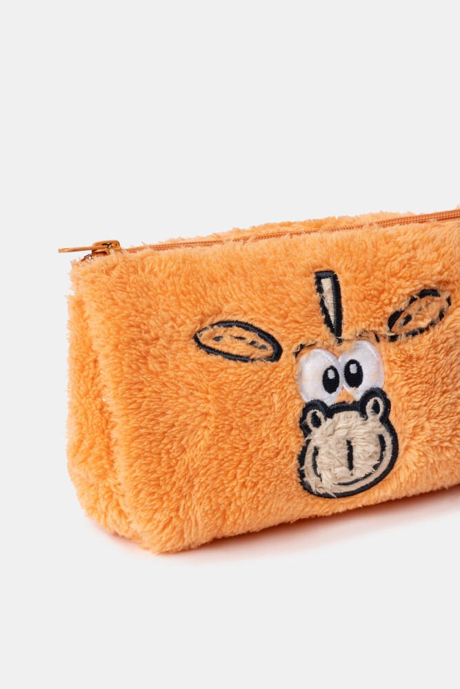 Zacht oranje teddy fleece tasje van Woody. Gebruik het als toilletzak of als pennenzak voor school. Het tasje heeft opvallende ogen en ponysnoet. 7x13cm groot.