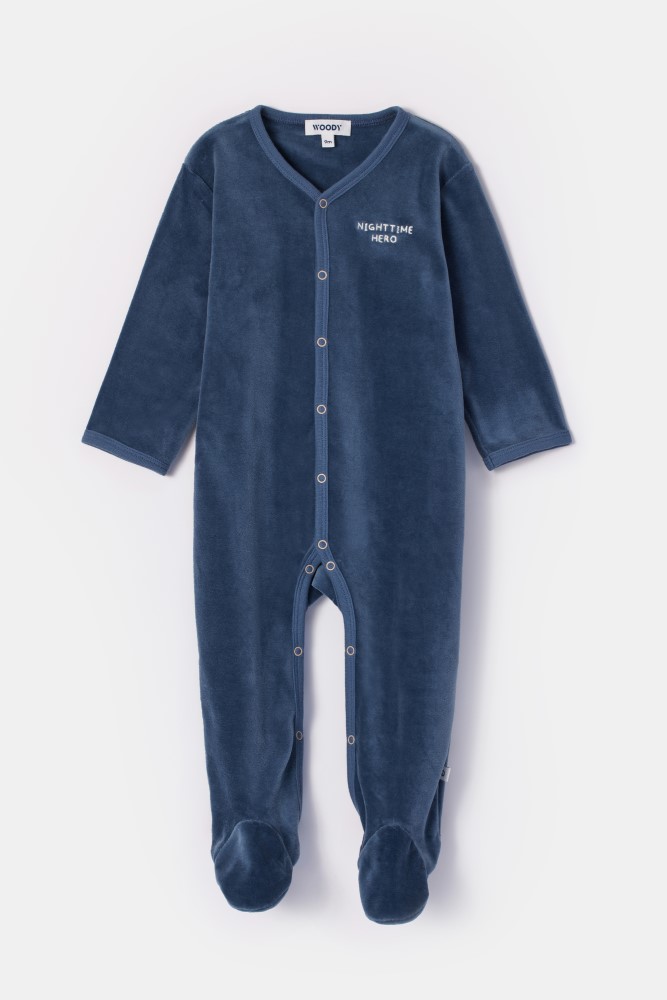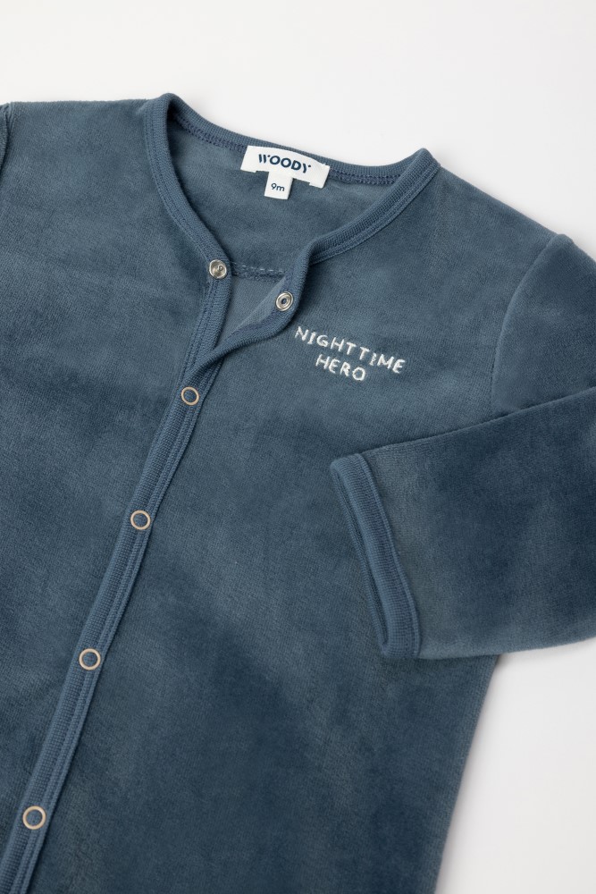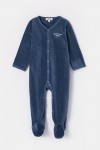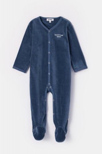 Blauwgrijs kruippakje in velours. Het kruippakje heeft voetjes en is verkrijgbaar in de maten 0m-18m. De maten 9m,12m en 18m hebben een antislip zool.