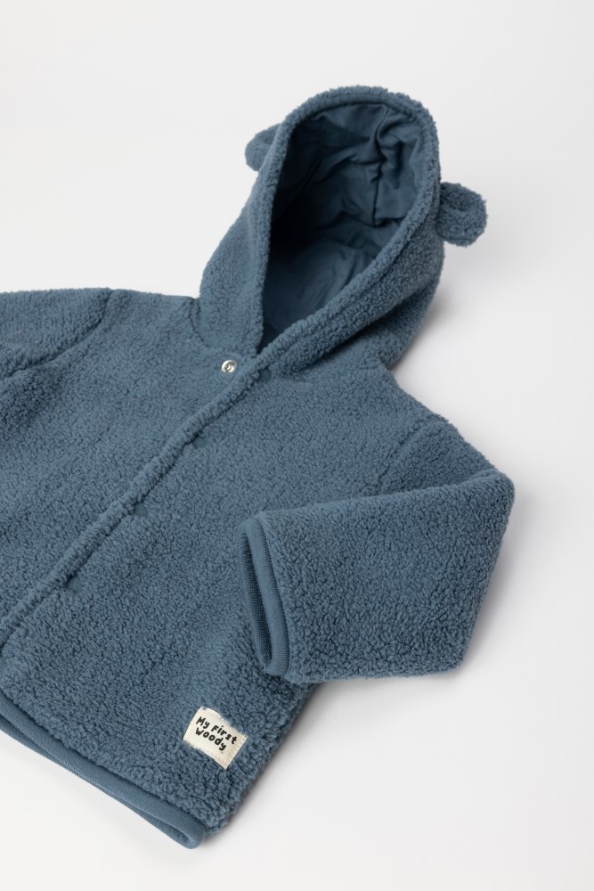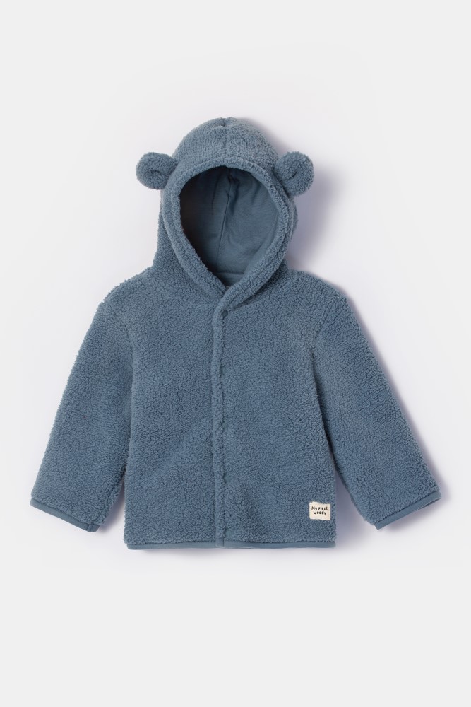 Blauwgrijze korte unisex jas van teddystof. De jas is verkrijgbaar in de maten 0m-4y.