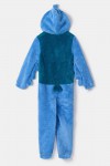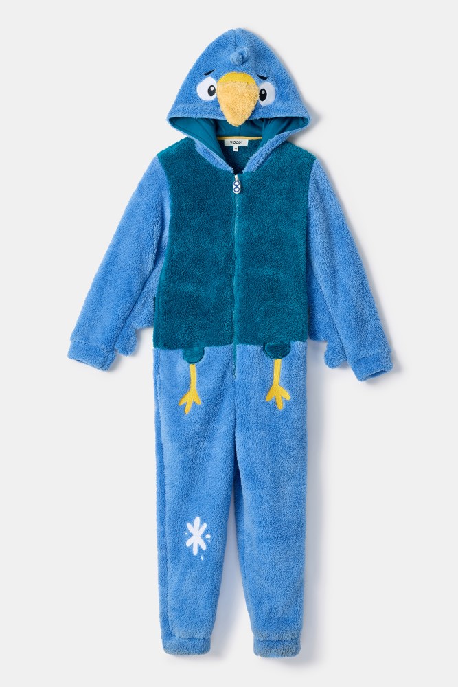 Blauwe unisex onesie van teddystof. De onesie heeft een capuchon met duifmotief. Verkrijgbaar in de maten 24m/2y-16y.