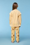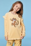 Lichtgele pyjama van velours. Het bovenstuk heeft een grote print van een kat, en een fantasie aan de hals en onderkant. De broek heeft een volledige kattenprint. Verkrijgbaar in de maten 0m-XXL. Voor de maten 0m-8y is er een sluiting in de rug voorzien.