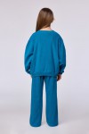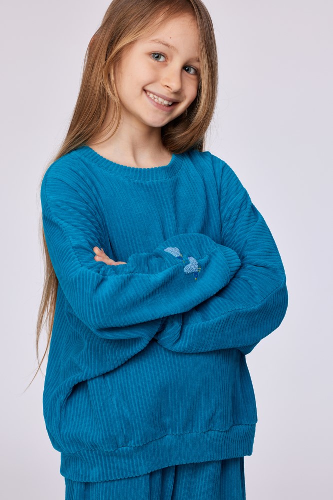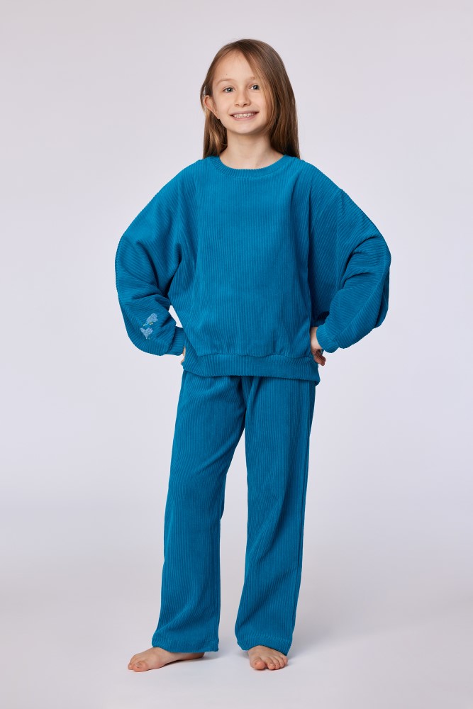 Pyjama van blauwgroene ribvelours. De brede broek zit los en comfortabel - net als de trui, die dankzij de brede aangestikte zijpanden vleermuismouwen krijgt. Op de trui staat een geborduurde print van duiven. Verkrijgbaar van 2y-XXL. Voor de maten 2y-8yis er een sluiting in de rug voorzien.
