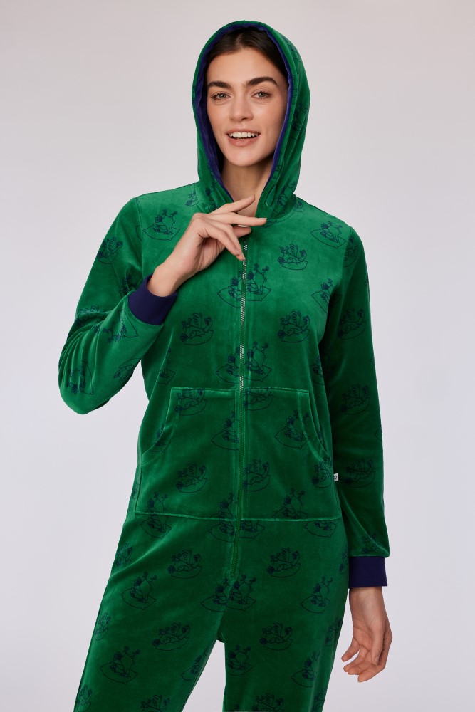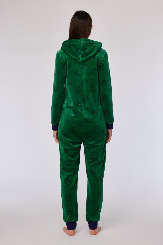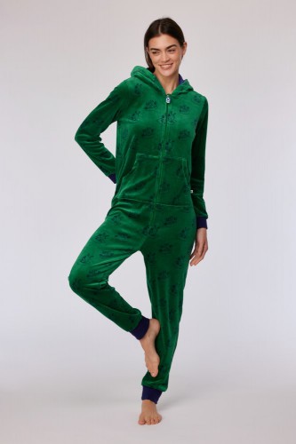 Groene unisex onesie van velours. De onesie heeft een donkerblauwe duivenprint en is verkrijgbaar in de maten 24m/2y-XXL.