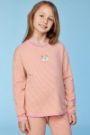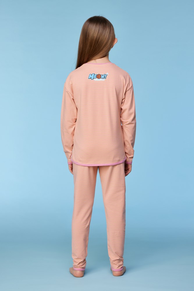 Roze-geel gestreepte pyjama van soepel katoen. Het bovenstuk heeft een kleine print op de borst en rug. Verkrijgbaar in de maten 0m-XXL. Voor de maten 0m-8y is er een sluiting in de rug voorzien.