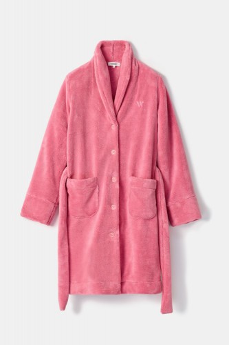 Roze kamerjas van fleece met twee zakken en een ceintuur. Verkrijgbaar in de maten XS-XXL.