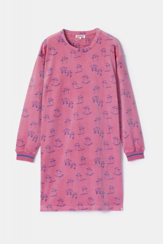 Roze slaapkleed van velours. Het slaapkleed met lange mouwen en een losse pasvorm heeft een all-over kattenprint. Verkrijgbaar in maten 24m/2y-XXL.