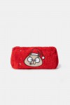 Rood teddyfleece tasje met speelse kattenprint. Als toiletzak of als pennenzak voor school. Afmetingen: 7x13cm.