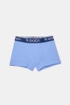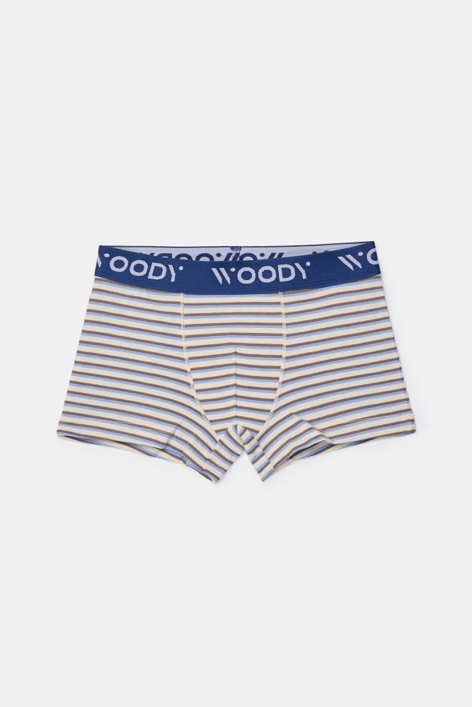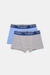 Set van 2 Woody aansluitende boxershorts van rekbaar, soepel katoen. Het duopack bestaat uit een effen blauwe boxershort en een gestreepte boxershort. Verkrijgbaar in maten 2Y-16Y.