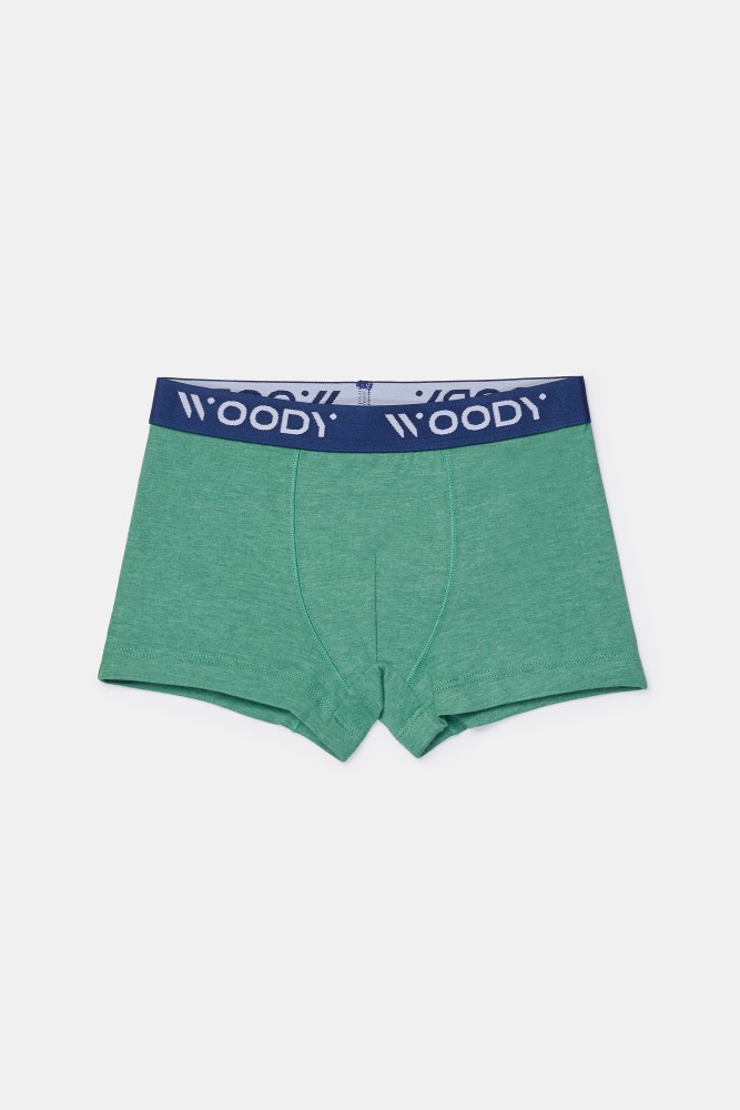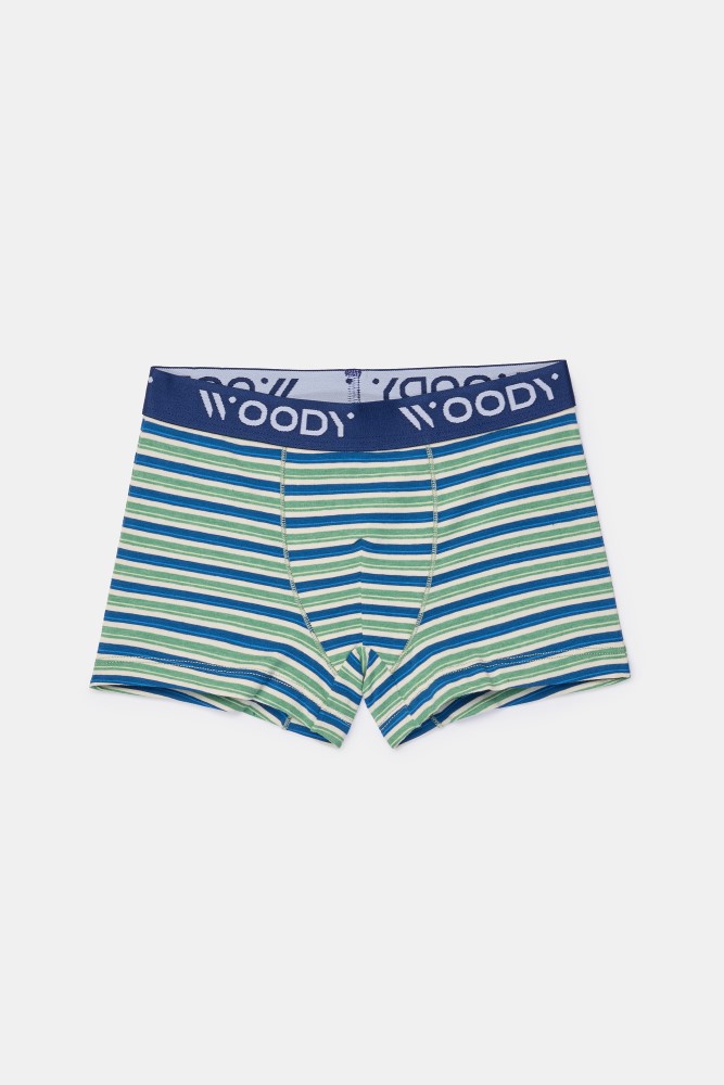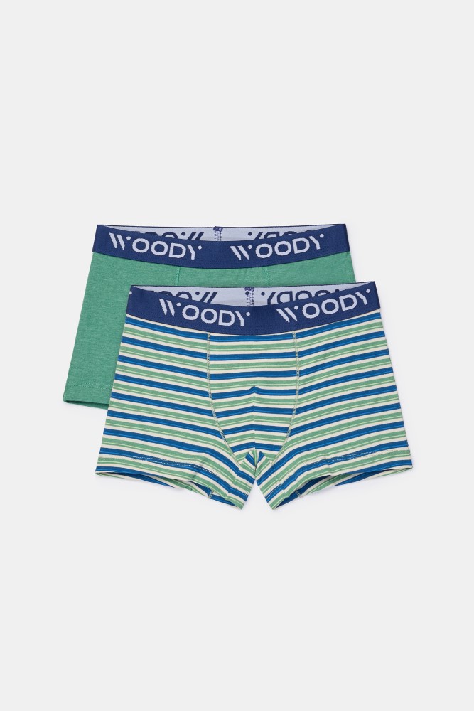 Set van 2 Woody aansluitende boxershorts van rekbaar, soepel katoen. Het duopack bestaat uit een effen groene boxershort en een gestreepte boxershort. Verkrijgbaar in maten 2Y-16Y.