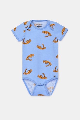 Blauwe body van soepel katoen met tijgerprint. Deze body heeft korte mouwen en is verkrijgbaar in de maten 0m-2Y.