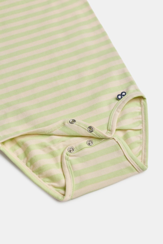 Groen gestreepte body van soepel katoen. Deze body heeft korte mouwen en is verkrijgbaar in de maten 0m-2Y.