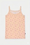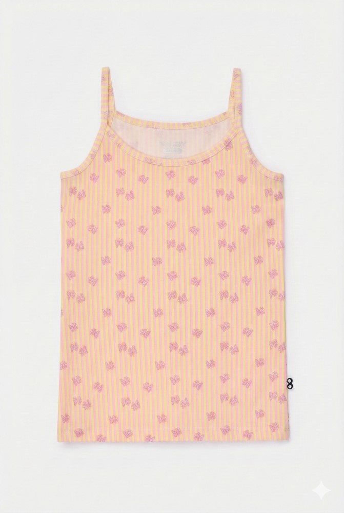 Zacht gele-roze Woody singlet met vlinderprint en spaghettibandjes voor meisjes in soepel en rekbaar katoen. Verkrijgbaar in maten 2Y-16Y.