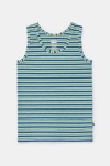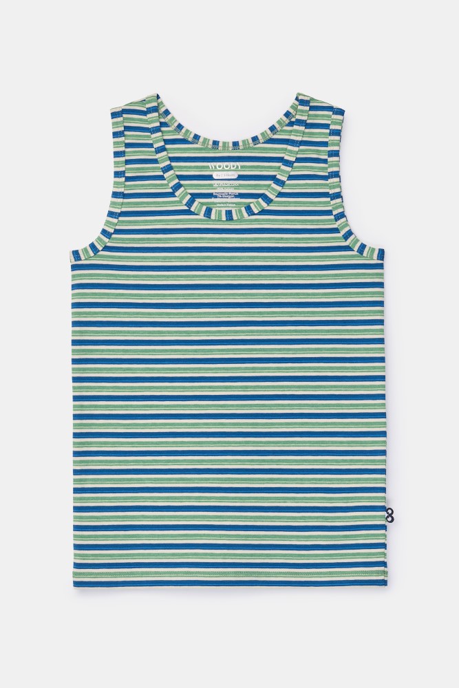 Groen-blauw gestreepte Woody singlet voor jongens in soepel en rekbaar katoen. Verkrijgbaar in maten 2Y-16Y.