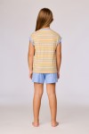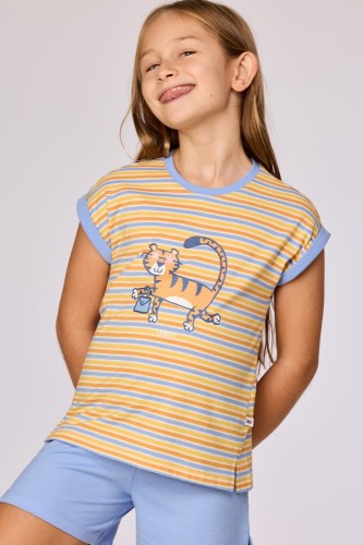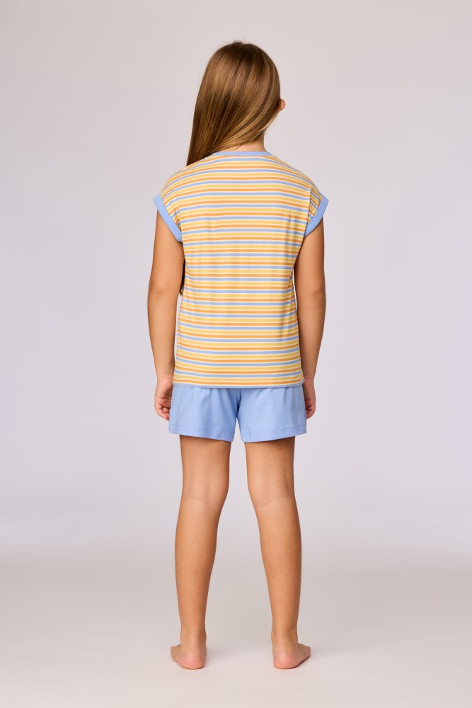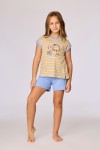 Kleurrijk gestreepte pyjama voor meisjes en dames van soepel katoen. Het gestreepte bovenstuk heeft korte mouwen en een grote kat als print. De pyjama wordt gecombineerd met een blauwe effen short. Verkrijgbaar in maten 3M-XXL.