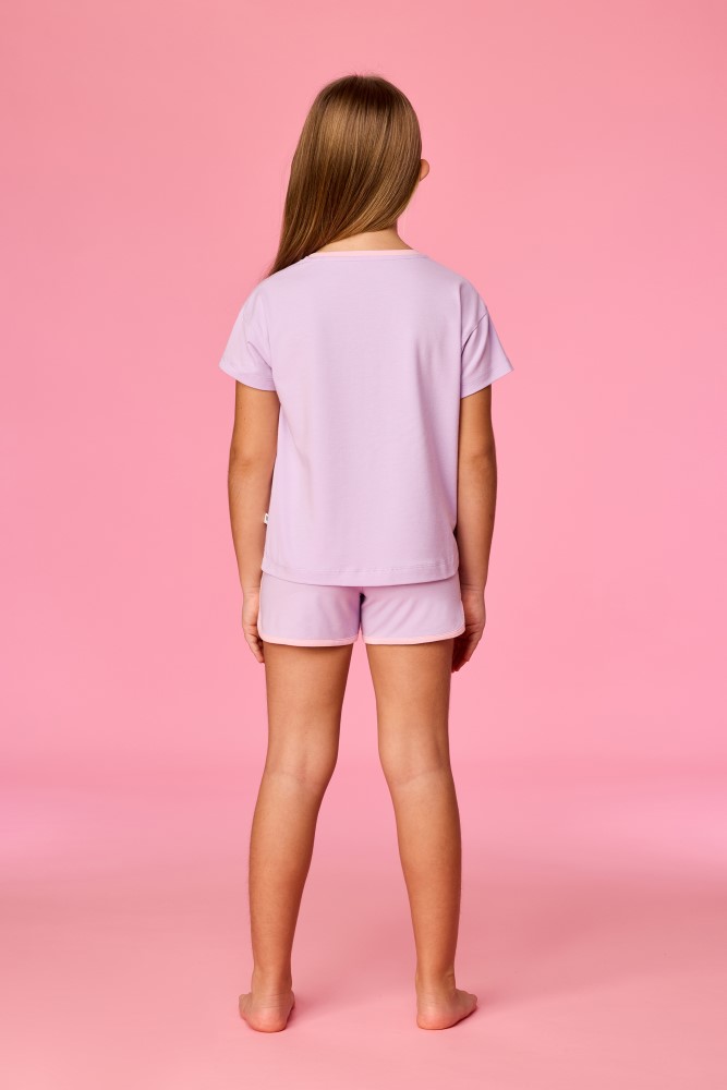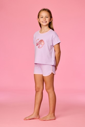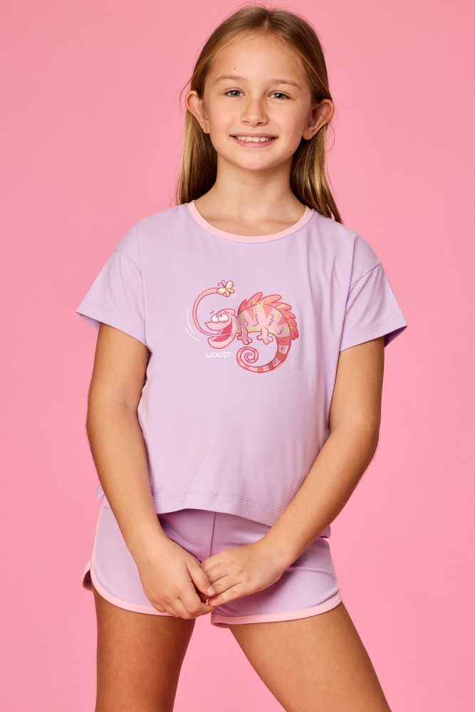 Meisjes en dames pyjama van soepel katoen. Het lila bovenstuk met korte mouwen valt op door de grote kameleonprint. Het bovenstuk wordt gecombineerd met een lila short in sportieve stijl, afgewerkt met een contrasterende bies. Verkrijgbaar in de maten 3M-XXL.