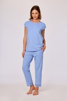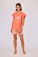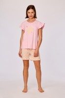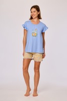 Meisjes en dames pyjama van soepel katoen. De geel gestreepte set met vlinderprint en korte mouwen heeft een short in sportieve stijl, afgewerkt met een contrasterende bies. Verkrijgbaar in de maten 3M-XXL.