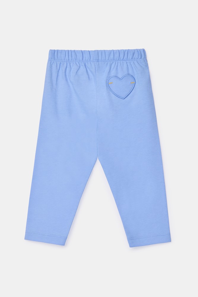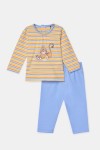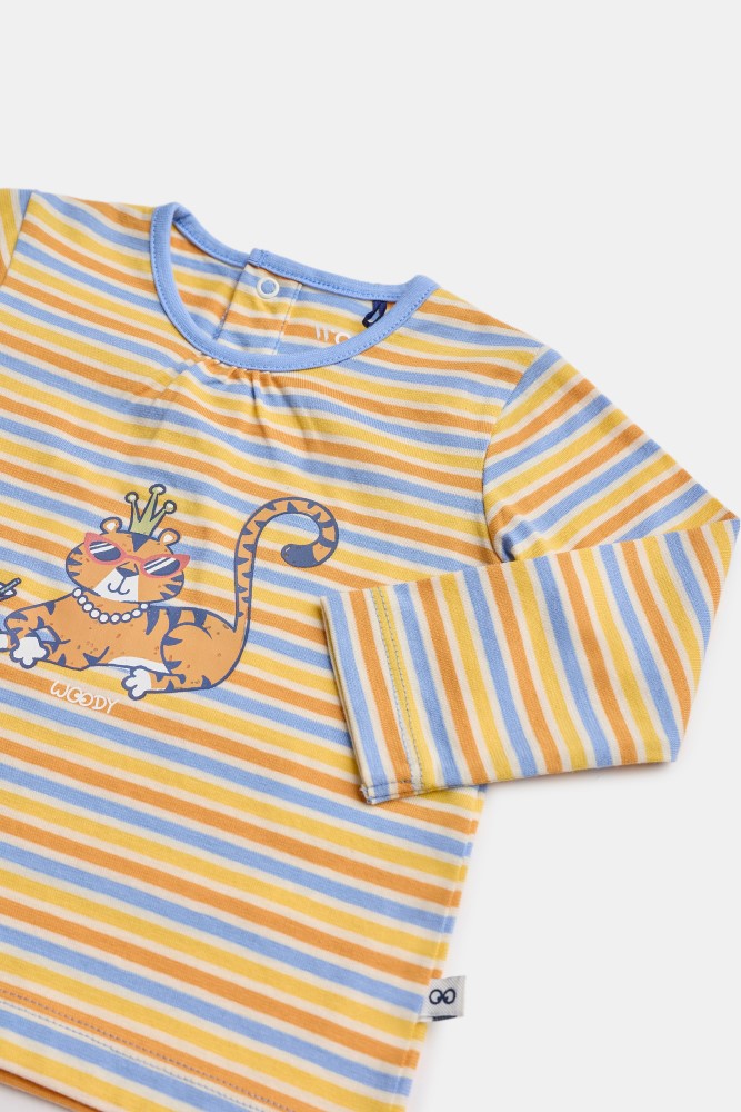 Tweedelige meisjes en dames pyjamaset van soepel katoen. Het gestreepte shirt heeft een tijgerprint en lange mouwen. Het bovenstuk wordt gecombineerd met een blauwe effen broek met elastische tailleband en een achterzak in hartjesvorm. Verkrijgbaar in maten 3M-XXL.