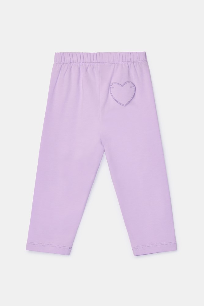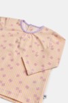 Tweedelige meisjes en dames pyjamaset van soepel katoen. Het gele gestreepte shirt heeft een vlinderprint en lange mouwen. Het bovenstuk wordt gecombineerd met een lila effen broek met elastische tailleband en een achterzak in hartjesvorm. Verkrijgbaar in maten 3M-XXL.