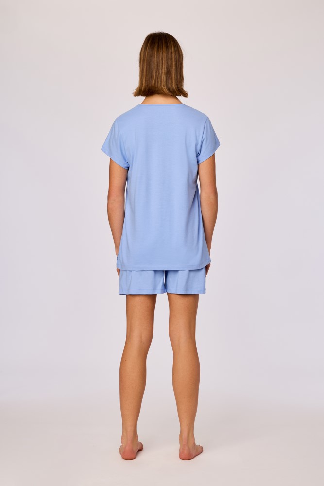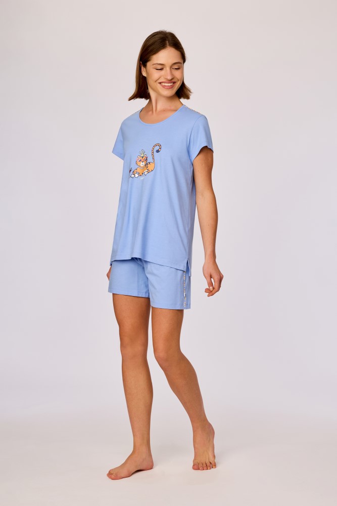 Deze blauwe pyjama van soepel katoen heeft een T-shirt met korte mouwen en een vrolijke print van een tijger met zonnebril. De schouders zijn afgewerkt met een kleurrijk detail dat mooi aansluit bij de print. De short heeft een comfortabele elastische taille en kleurrijke accenten langs de zijnaden. Dankzij de soepele katoenkwaliteit voelt deze pyjama licht en luchtig aan.