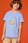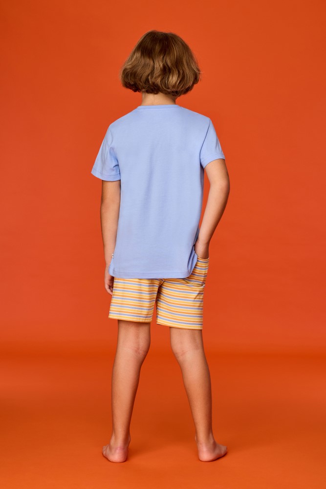 Jongens en heren pyjama van soepel katoen. Het blauwe effen bovenstuk valt op door de grote vrolijke glow-in-the-dark dierenprint. Het bovenstuk wordt gecombineerd met een kleurrijk gestreepte short. Verkrijgbaar in de maten 3M-XXL.