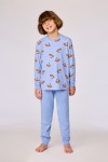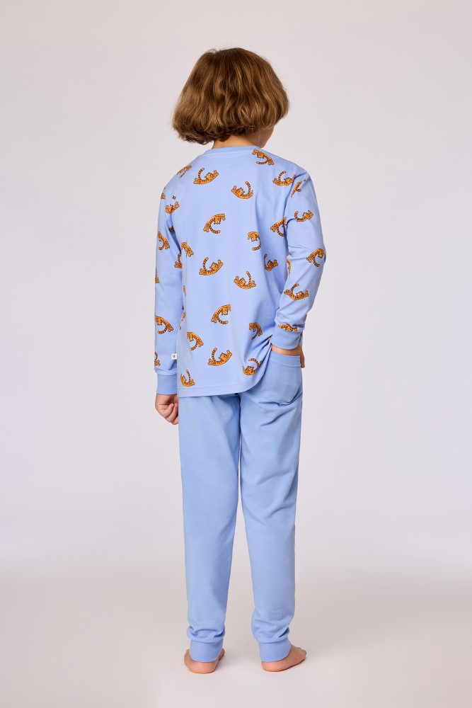 Tweedelige jongens en heren pyjamaset van soepel katoen. De blauwe T-shirt heeft een ronde hals, lange mouwen en een all over print met springende tijgers. De broek is uitgevoerd in effen blauw en voorzien van een elastische tailleband. Zowel de mouwen als de broekspijpen zijn afgewerkt met boorden. Beschikbaar in de maten 3m-XXL.