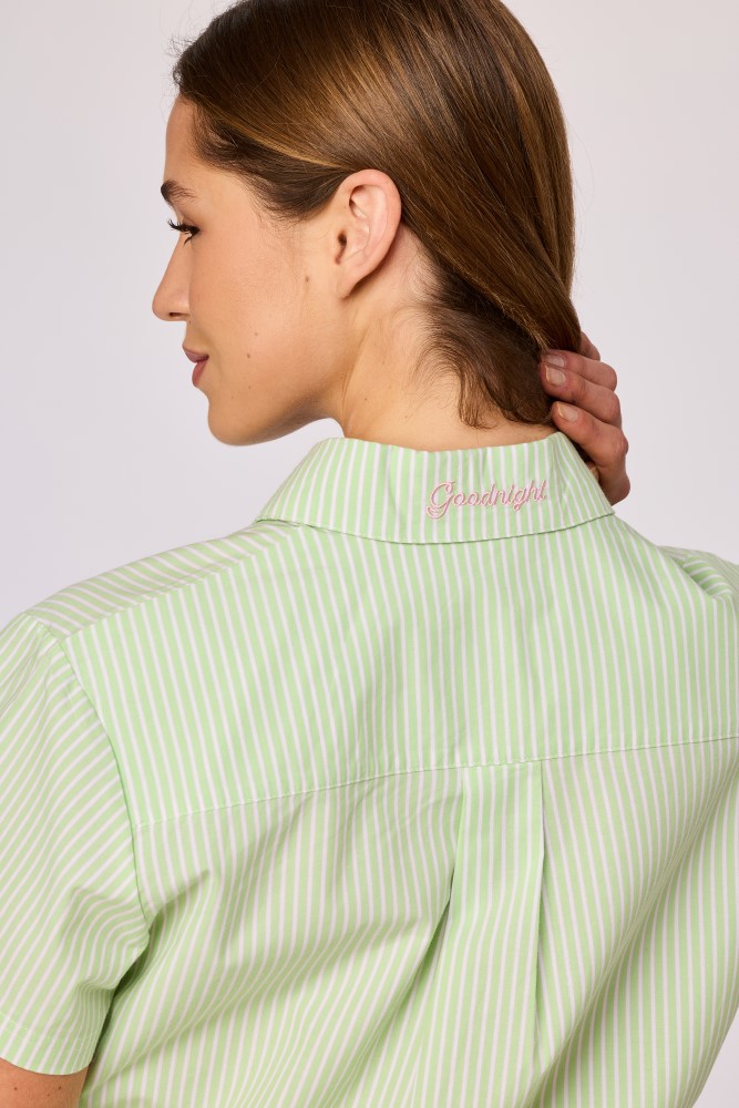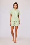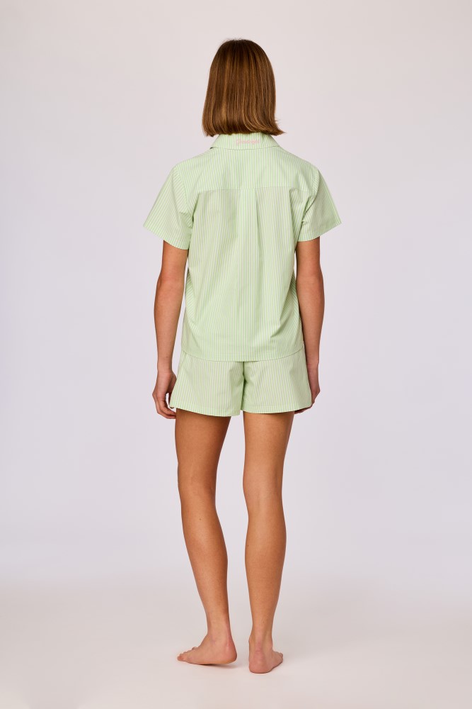 Deze groen-wit gestreepte doorknooppyjama heeft korte mouwen en een klassieke kraag. De fijne verticale strepen geven de pyjama een klassieke en tegelijk moderne uitstraling. De bijpassende short heeft een elastische taille en handige zakjes. Beschikbaar in maten 2Y - XXL.