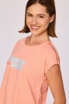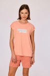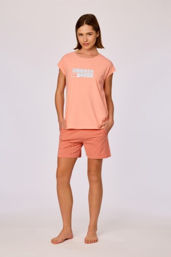 Deze oranje pyjama van soepel katoen bestaat uit een oranje T-shirt met korte mouwen en een ronde hals, afgewerkt met een centrale tekst voor de maten 12Y-XXL. Voor de maten 2Y-10Y is dit een kleine olifant. De bijpassende short is uitgevoerd met een streepjespatroon en een elastische tailleband. Verkrijgbaar in de maten 2Y-XXL.