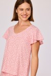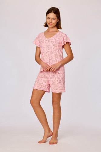 Tweedelige set van soepel katoen voor meisjes en dames. De roze set heeft een all over strikjesprint en bestaat uit een T-shirt met korte aangeknipte mouwen en een V hals. De short is voorzien van een elastische tailleband en een subtiele rucherand. Beschikbaar in de maten 12Y-XXL.
