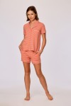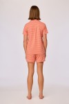 Deze perzikoranje - koraalrode gestreepte pyjama van soepel katoen combineert comfort met een tijdloze uitstraling. Het hemdje met korte mouwen heeft een klassieke kraag, een doorlopende knopensluiting en een borstzakje. De fijne biesafwerking in een lichte contrastkleur geeft de pyjama een verfijnde en verzorgde look. De bijpassende short heeft een elastische taille en valt soepel rond het lichaam. Verkrijgbaar in de maten 2Y-XXL.