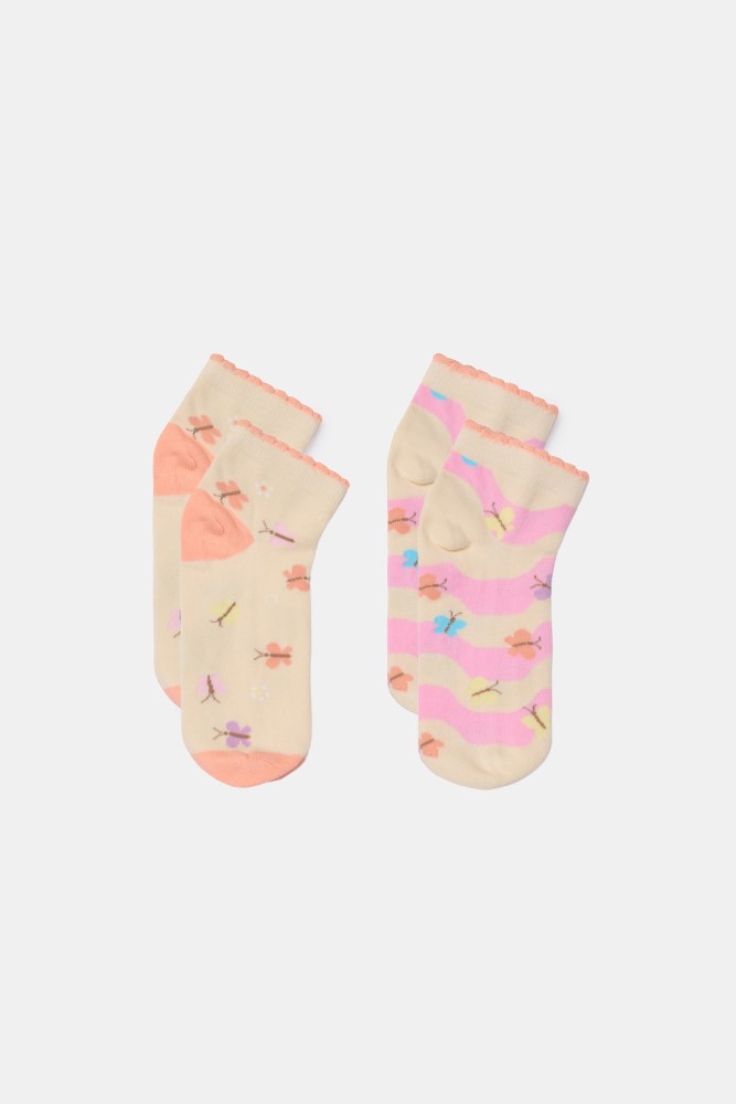 Kleurrijke set van twee paar korte sokken van fijn katoen. Beide sokken hebben een vlinderprint. Verkrijgbaar in de maten 0-6m tot 43-46.