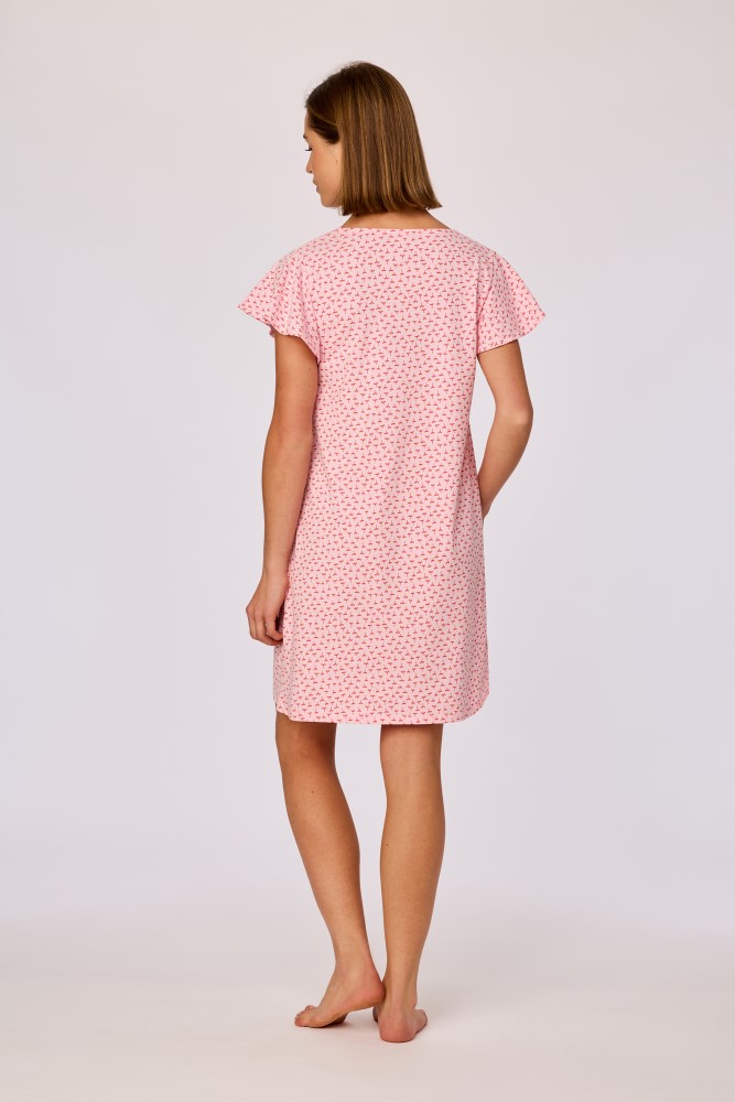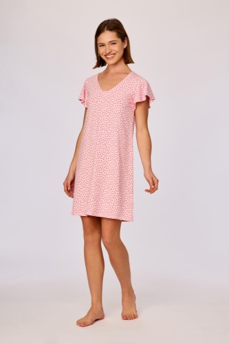 Roze slaapkleed voor meisjes en dames van soepel katoen. Dit slaapkleed met strikjesprint is uitgevoerd in een zachte roze tint en heeft een rechte, losvallende pasvorm tot net boven de knie. Het model is voorzien van een V hals en korte mouwen met een subtiele uitlopende afwerking. Verkrijgbaar in maten 12Y-XXL.