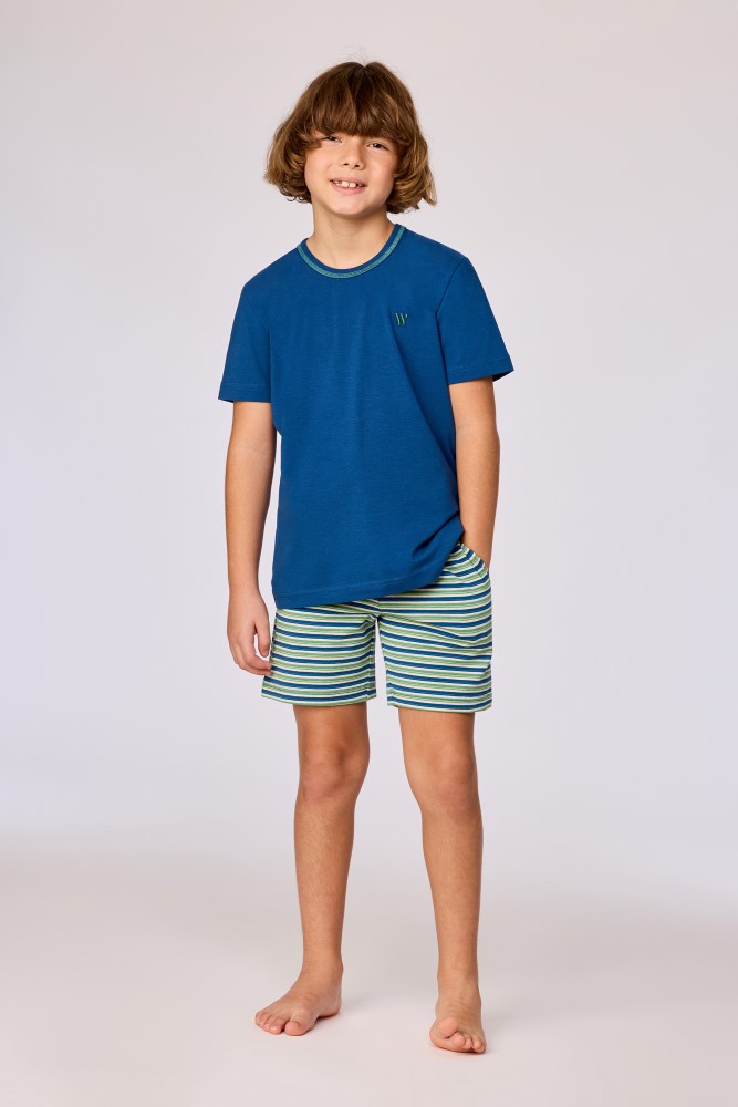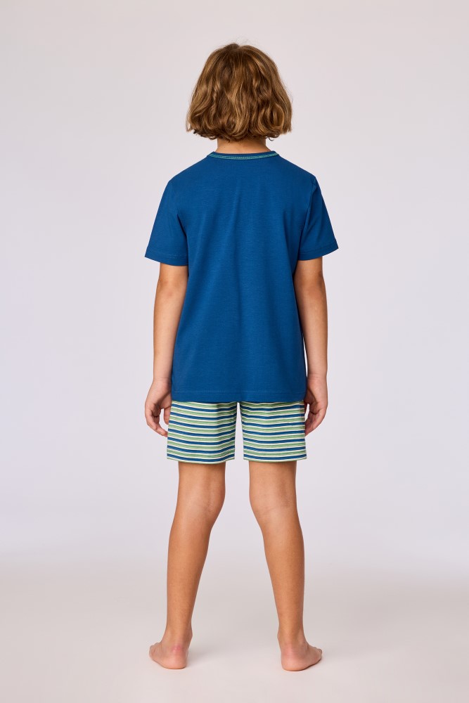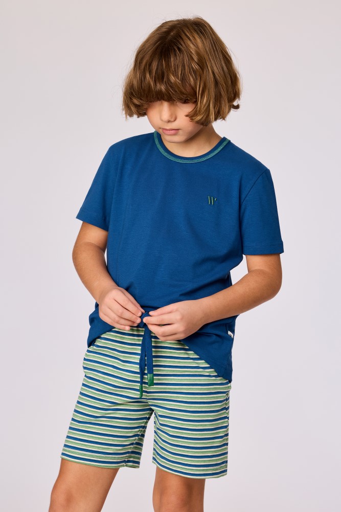 Jongens en heren pyjamaset bestaande uit een effen T-shirt en een short van rekbaar en soepel katoen. Het blauwe T-shirt heeft korte mouwen, een ronde hals met een contrasterende afwerking en een klein logo op borsthoogte. De gestreepte short heeft eenhorizontaal streeppatroon in meerdere tinten, een elastische tailleband met aantrekkoord en een rechte pijp. De achterzijde van de short is uitgevoerd in hetzelfde streeppatroon.