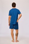 Deze donkerblauwe jongens en heren pyjama van rekbaar katoen bestaat uit een T-shirt met korte mouwen en een bijpassende short. Het T shirt heeft een ronde hals, een borstzak aan de linkerzijde en een kleine decoratieve print boven de borstzak. De shortis uitgevoerd met een all over patroon, een elastische tailleband en een aantrekkoord.