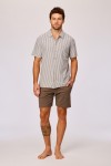 Deze heren pyjamaset bestaat uit een bruin-blauw gestreepte shirt met korte mouwen en een bijpassende bruine short . Het shirt is voorzien van een kraag, een knoopsluiting aan de voorzijde en een borstzak. De short heeft een elastische tailleband. Verkrijgbaar in de maten S-XXL
