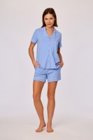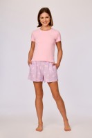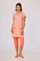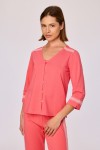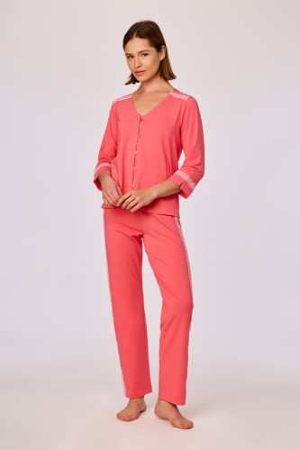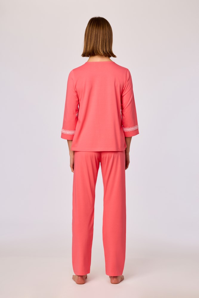Deze tweedelige dames pyjamaset bestaat uit een koraalkleurige top en een bijpassende lange broek. De top heeft een V-hals, een knoopsluiting aan de voorzijde en driekwartmouwen met een contrasterende kanten afwerking aan de schouders en mouwboorden. Debroek heeft een rechte pijp en is afgewerkt met een verticale kanten inzet langs de zijkanten. Zowel top als broek hebben een rechte pasvorm en een effen kleur. Verkrijgbaar in maten XS-XXL.