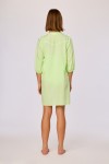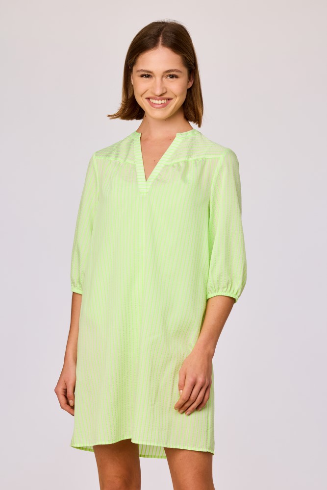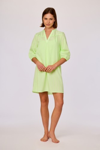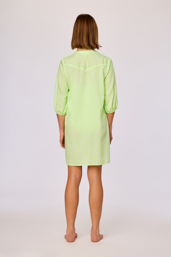 Lichtgroene korte strandjurk met een fijne verticale streepstructuur. Het model heeft een V-hals met een korte opstaande kraag en een subtiele plooinaad aan de schouderlijn. De jurk is recht van snit en valt los rond het lichaam. De mouwen zijn driekwartlengte en afgewerkt met een elastische zoom. De onderzijde is recht afgewerkt met een smalle zoom. De stof is licht van gewicht en doorschijnend. Beschikbaar in de maten XS-XXL.