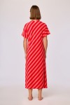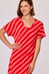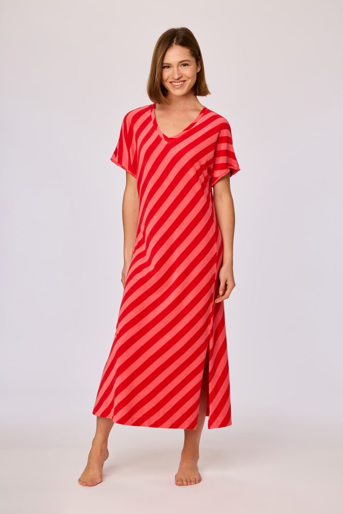 Deze rood-roze gestreepte strandjurk heeft een rechte, lange pasvorm tot halverwege de kuit. Het model is voorzien van korte mouwen, een V hals en een opgestikte borstzak aan de voorzijde. De mouwboorden en hals zijn afgewerkt met een fijne rand. Aan dezijkant heeft de jurk een split. De jurk is gemaakt van badstof. Verkrijgbaar in maten XS-XXL.