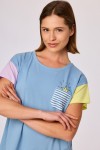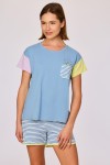 Deze pyjama van soepel katoen maakt deel uit van de collectie Woody x Het Hannekesnest. Het model bestaat uit een T-shirt met korte mouwen en een bijpassende korte broek. De pyjamatop is afgewerkt met contrasterende mouwen in pastelkleuren en een ster illustratie op de borst. De bijpassende short heeft een blauw wit streeppatroon, een elastische tailleband met lila kleuraccent en is afgewerkt met een kleurrijke contrastbies.